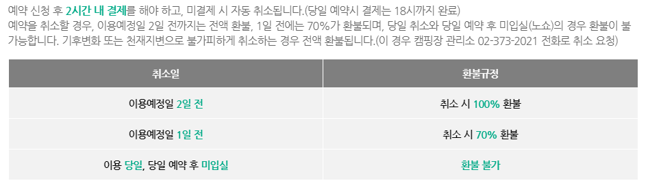 난지 캠핑장 이용에 대한 요금표는 아래와 같습니다. 예약은 서울시 공공서비스예약 사이트를 통해 미리 진행해야 합니다.