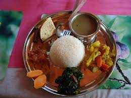 Dal Bhat은 네팔 가정의 주식입니다. 야채 카레, 피클, 파파드와 같은 다양한 반찬과 함께 찐 쌀(bhat)과 함께 제공되는 렌즈콩 수프(dal)로 구성됩니다. 이 건강에 좋은 식사는 단백질, 탄수화물 및 필수 영양소의 균형 잡힌 조합을 제공합니다.